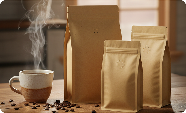 We offer 100% compostable kraft pouches made from virgin kraft paper and compostable inner linings, providing a fully biodegradable packaging solution. Recycled kraft paper options are also available, paired with barrier liners for shelf-life integrity.