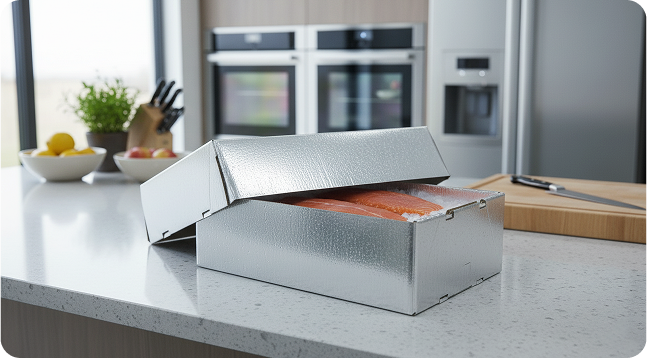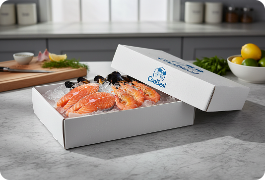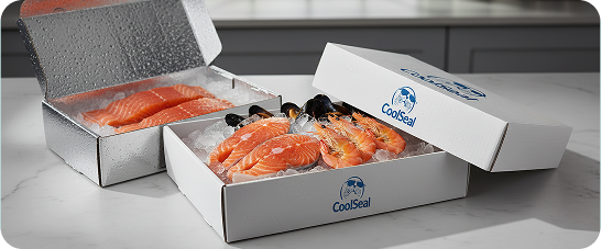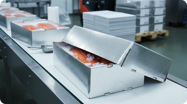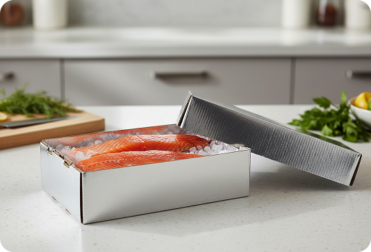 Crafted from food-grade corrugated cardboard laminated with reflective metallised polyester, Chilltainers offer thermal insulation, moisture protection, and brand-ready surfaces for chilled and frozen seafood.